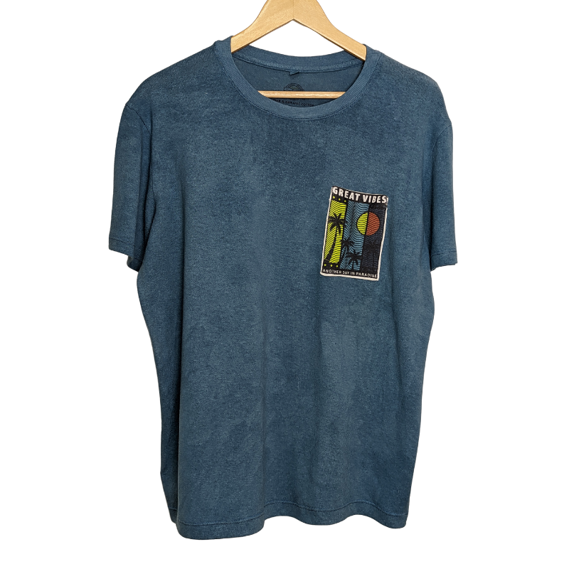 Adding a touch of uniqueness, we’ve adorned the T-shirt with a chest pocket made from printed hemp cotton fabric. The great vibes print showcases our dedication to merging timeless style with an artistic twist.